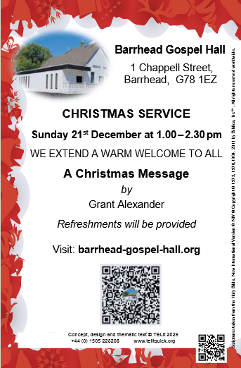Latest - Barrhead Gospel Hall will be open each Sunday at 3:45pm. Tea and refreshments will be served with a short message from the Bible. We extend a warm invitation to all to come and join us. We look forward to seeing you. The mother and toddlers group is on each Tuesday at 9:30am