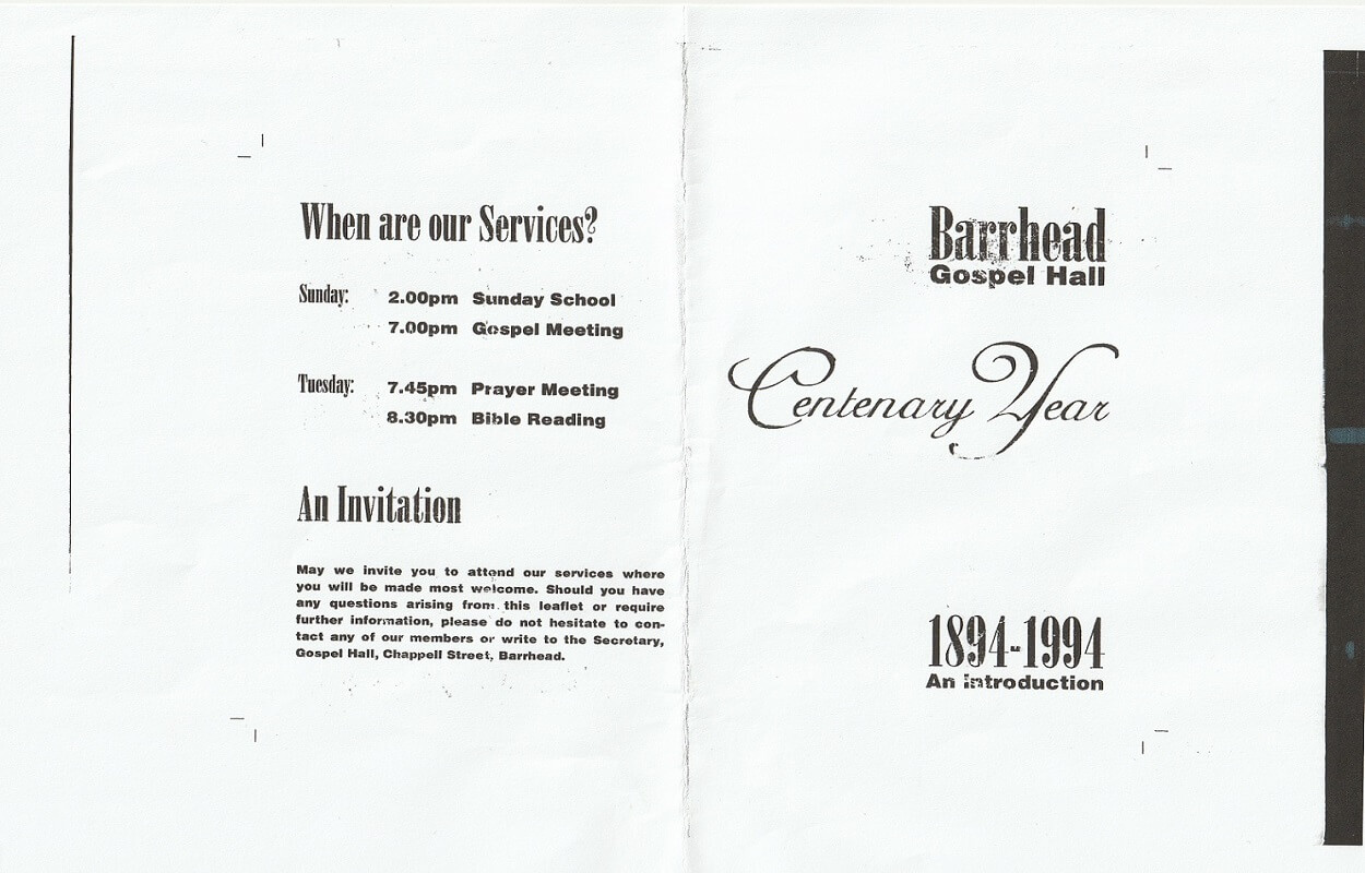 The history of this local church can be traced back to 1894 when it was established. In this year a group of Christians began to meet in the building called 'Barrhead Gospel Hall' at Chappell Street, Barrhead where they established this independent local church based simply on New Testament principles.